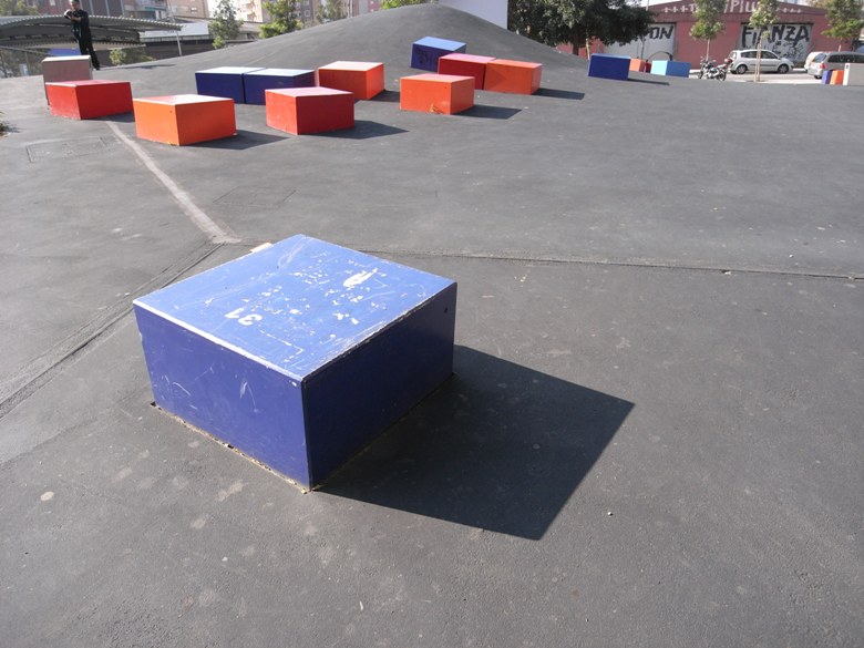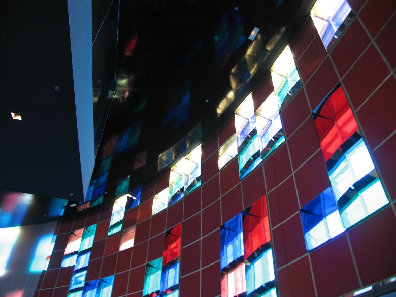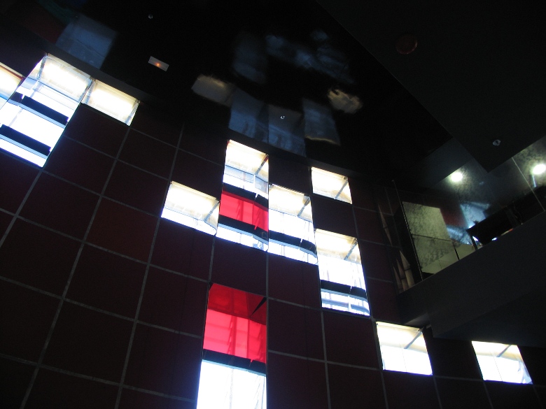 色付きの金属製パネルがパズルのようにランダム配置されてており、それをガラス越しにみることになるので、