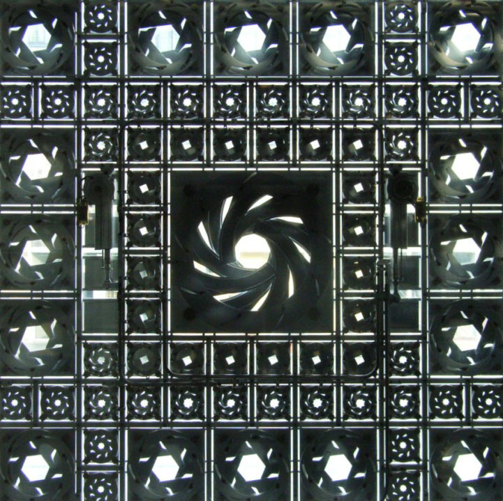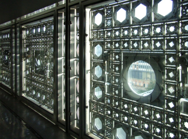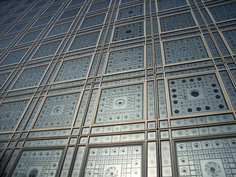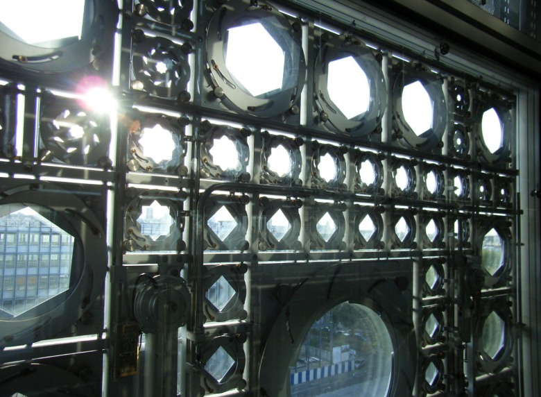 アラブ世界研究所の建物壁面に、ガラスパネルで出来た幾何学模様の正体は、太陽光線に応じて、カメラレンズのように開閉するという絞込みを応用した、ダイヤグラムになっています。