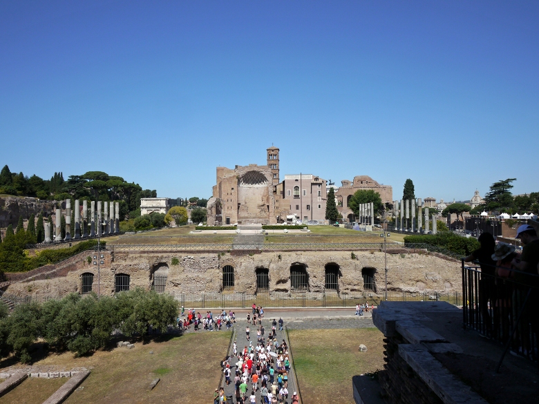 当時のコロッセオ広場には、ヴィーナスとローマの女神の神殿(写真中央正面)、ネロの巨像(写真右側)がありました。