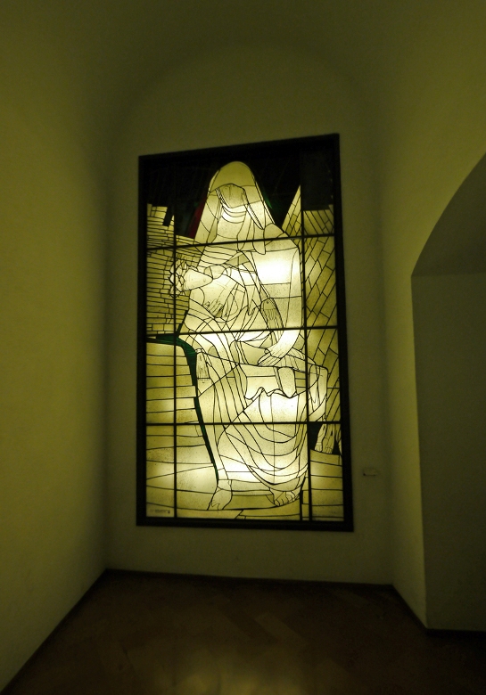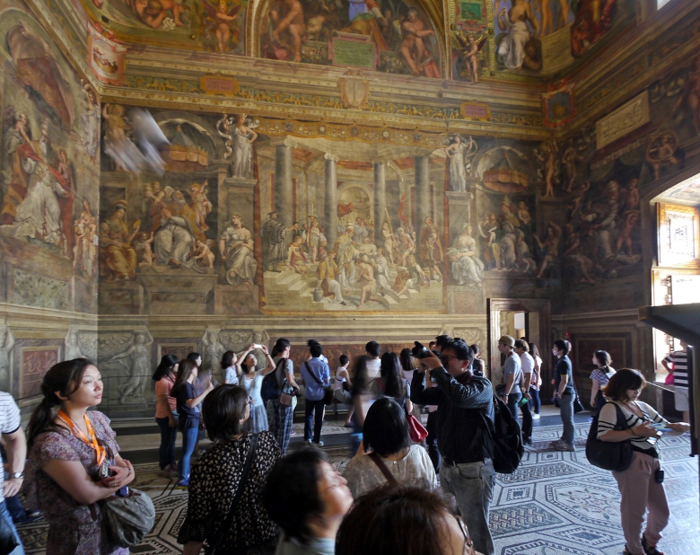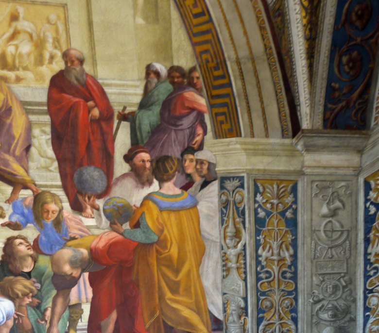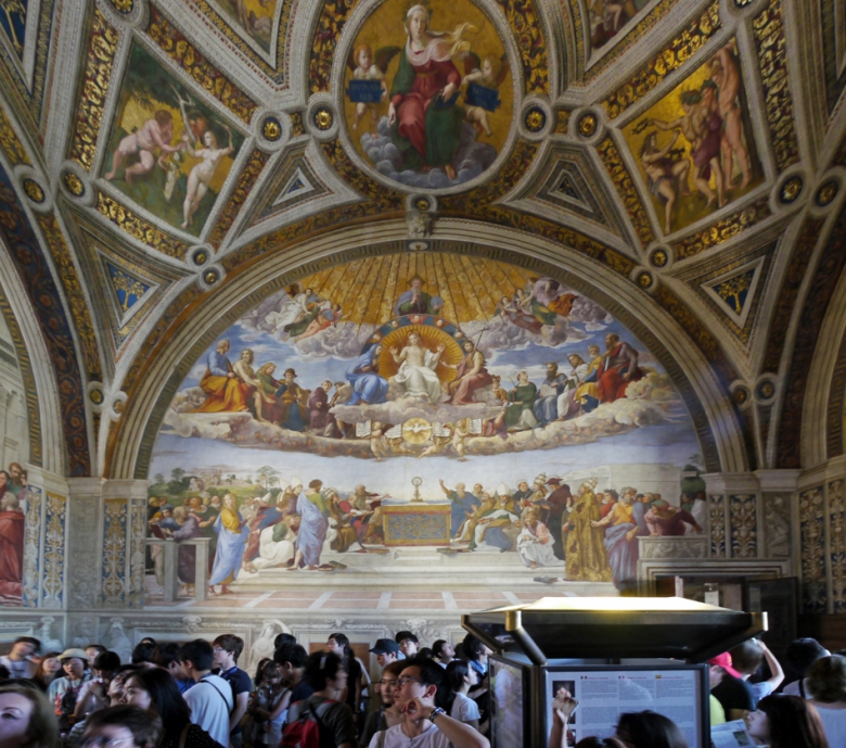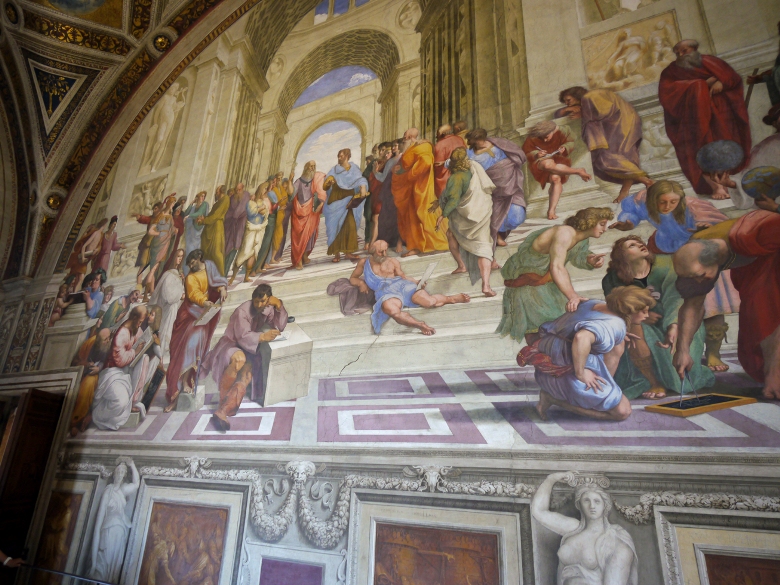 ↑「アテネの学堂」の右端、写真中央の白っぽい帽子をかぶった人物の左側にラファエロがいます。