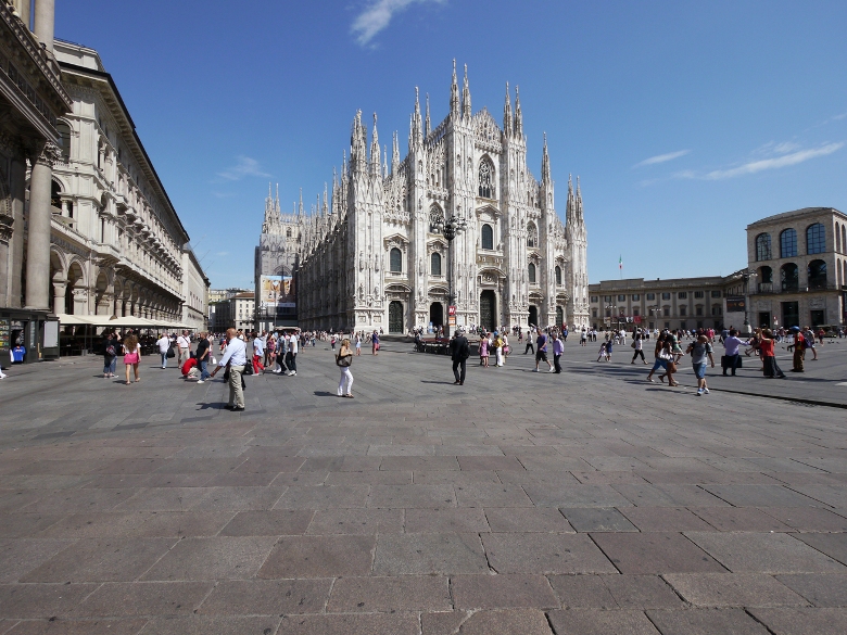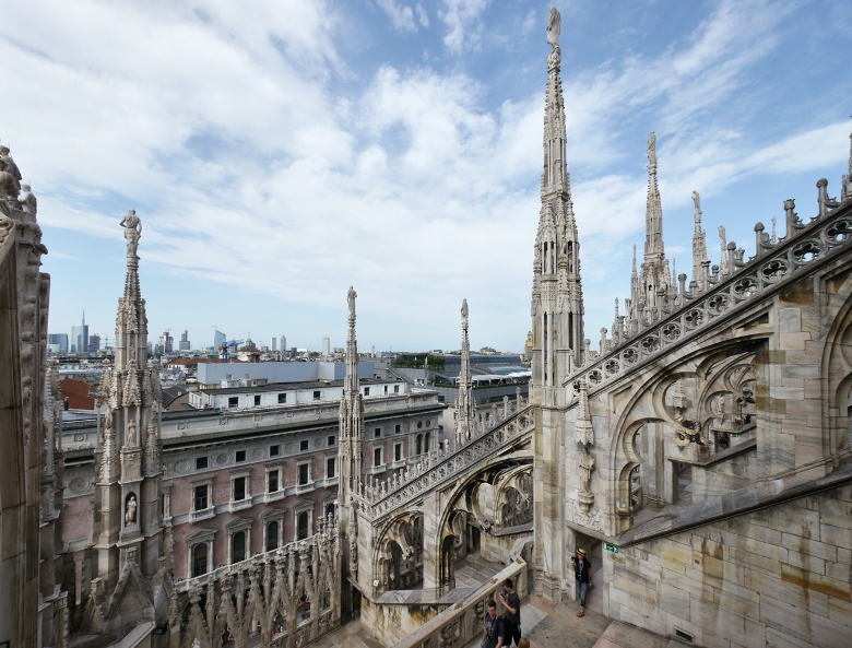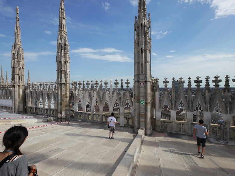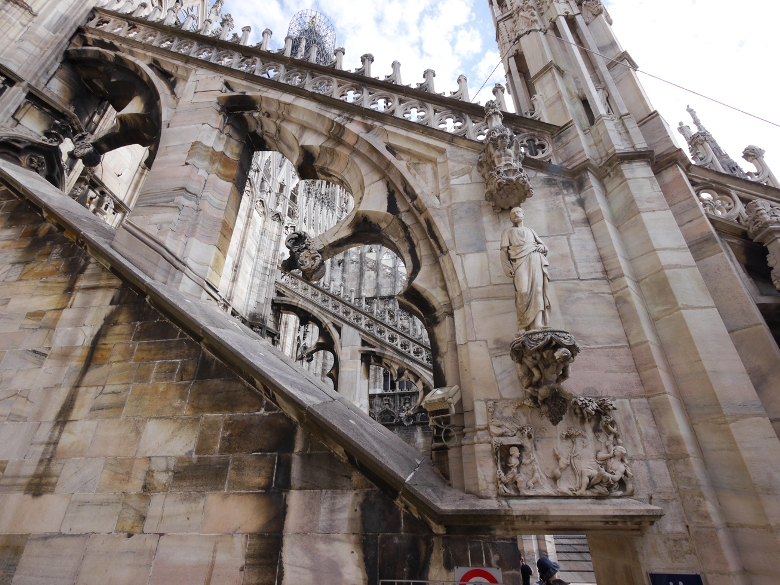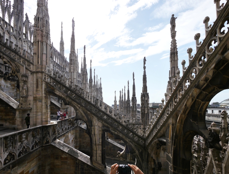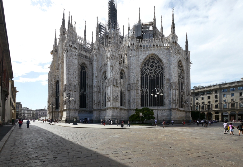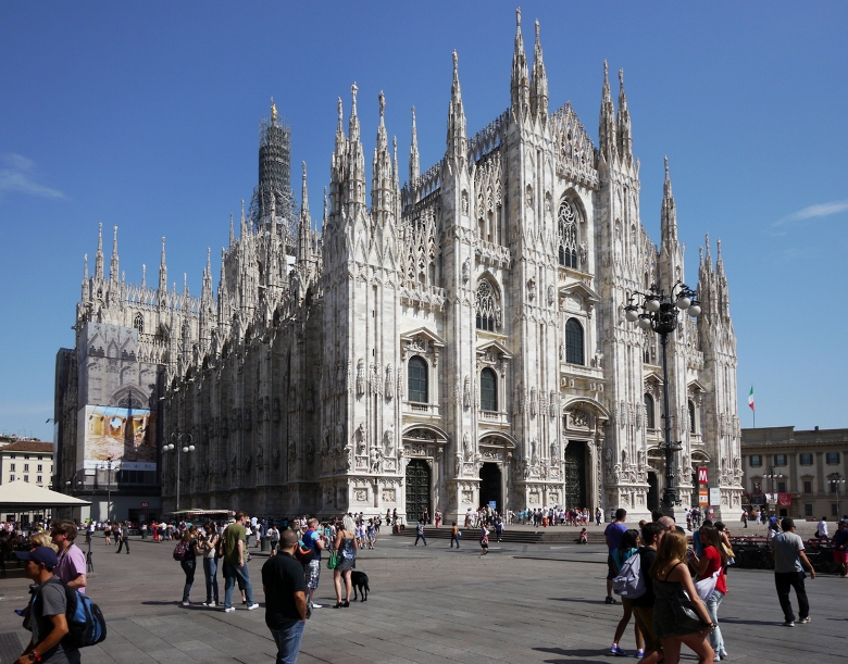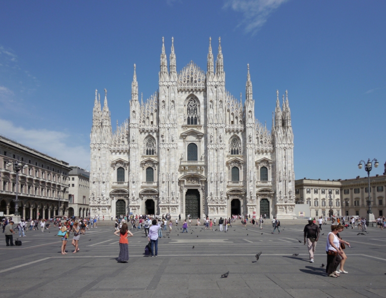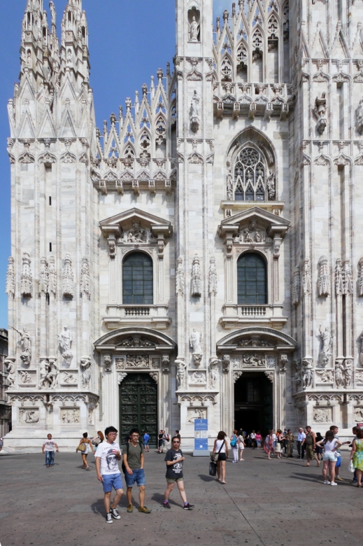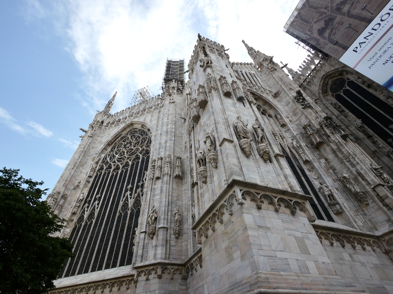 ミラノのドゥオモは1386年から建築され、約500年後の19世紀に完成した世界最大級のゴシック建築です。都市の中心に位置し、ミラノのシンボルになっている大聖堂です。 135本もある尖塔や彫刻などの装飾が美しい。