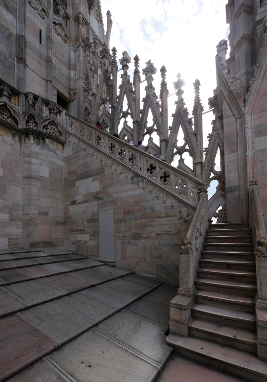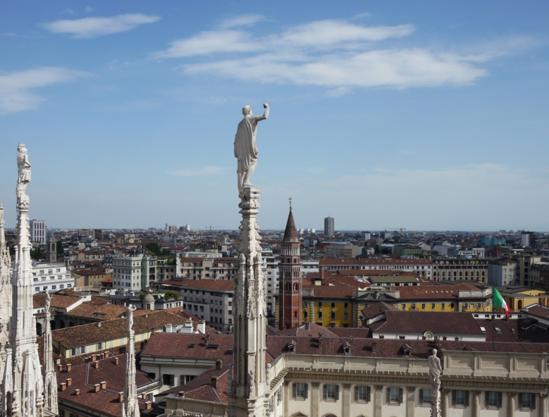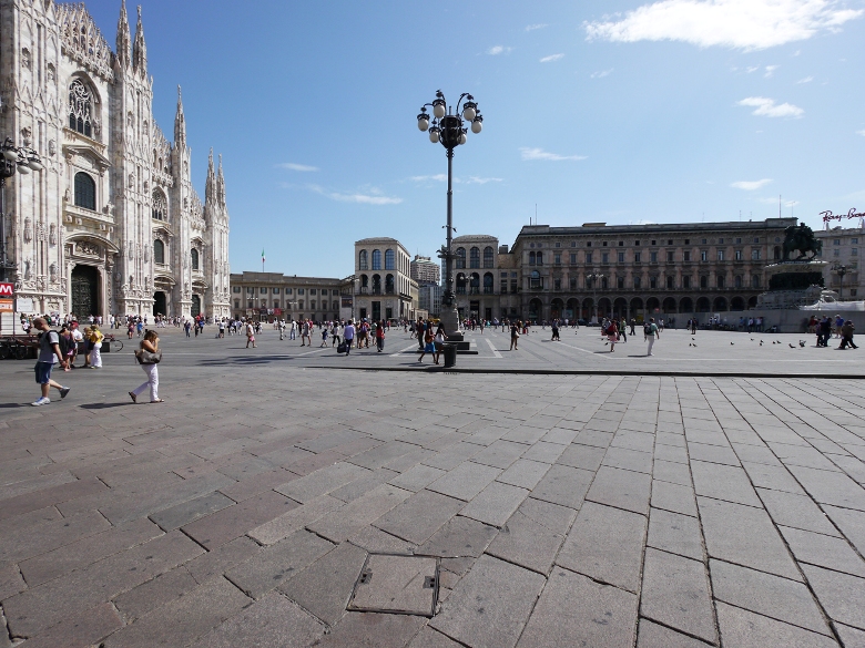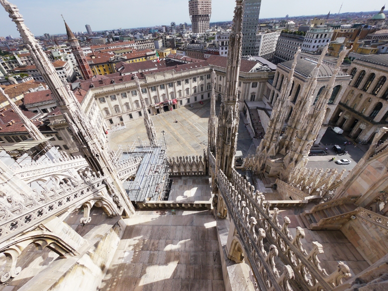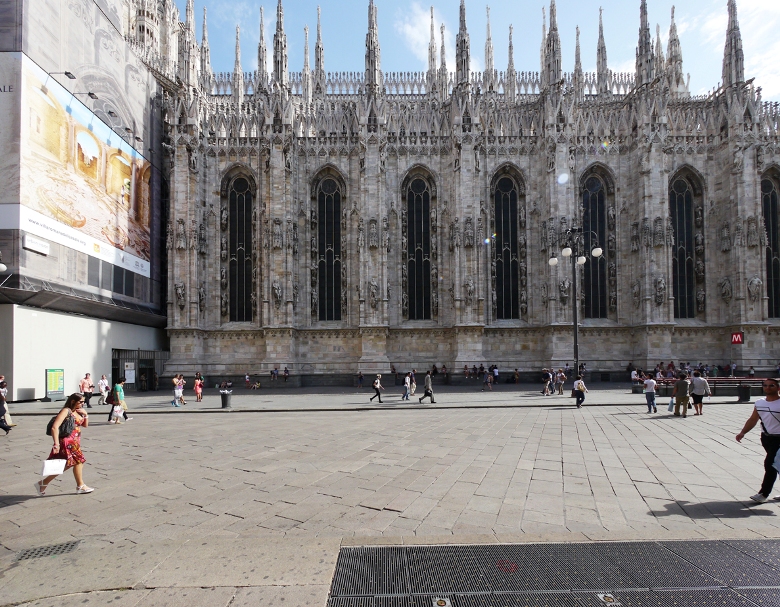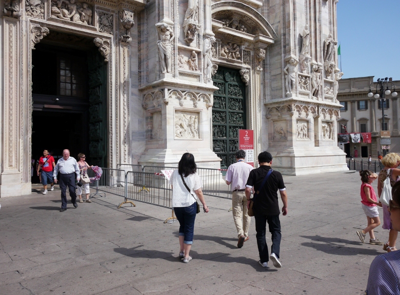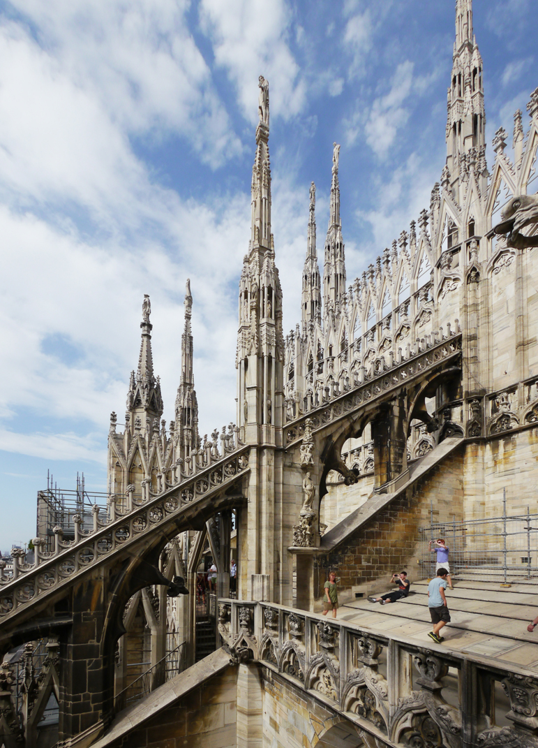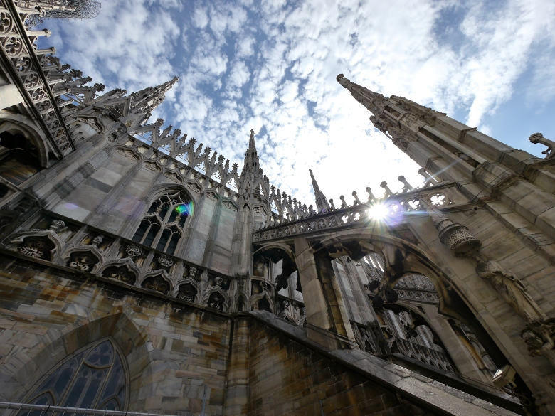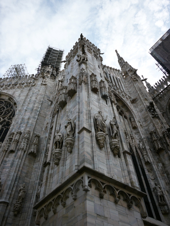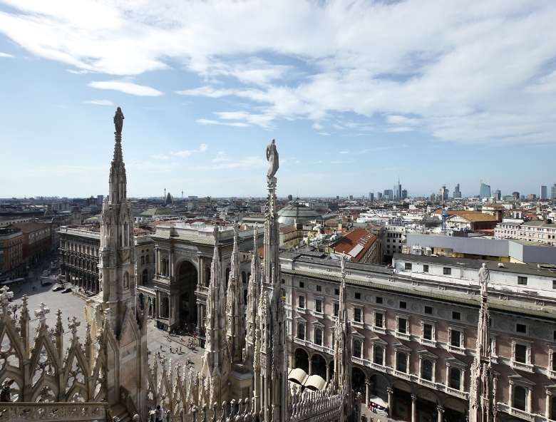ミラノのドゥオモは1386年から建築され、約500年後の19世紀に完成した世界最大級のゴシック建築です。都市の中心に位置し、ミラノのシンボルになっている大聖堂です。 135本もある尖塔や彫刻などの装飾が美しい。